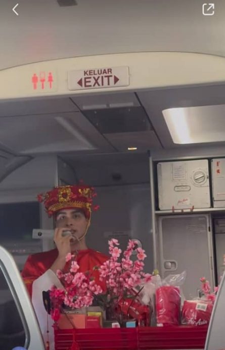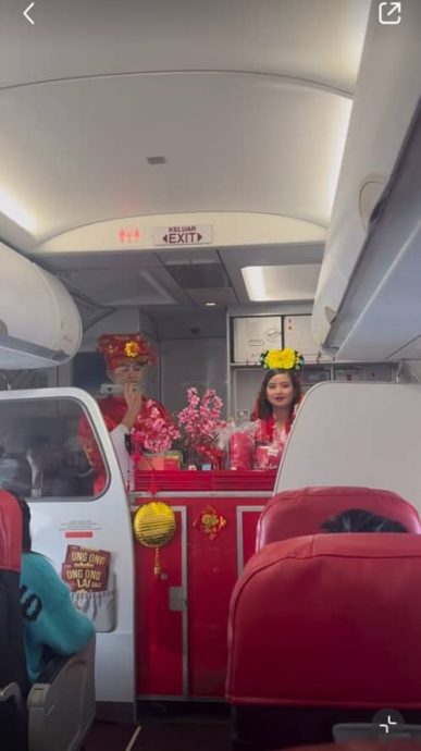 (八打灵再也16日讯)配合农历新年,亚航空少改穿财神爷服装卖货,空姐则以格格服装亮相,在万米高空上为乘客带来惊喜。