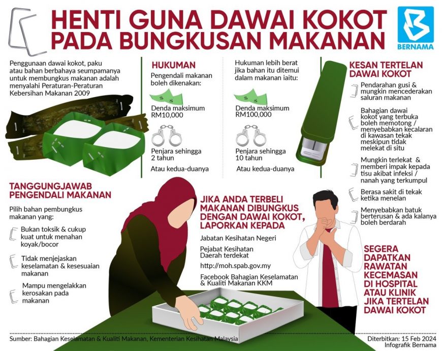 Infografik : Penggunaan dawai kokot, paku atau bahan berbahaya seumpamanya untuk membungkus makanan adalah menyalahi Peraturan-Peraturan Kebersihan Makanan 2009 pic.twitter.com/Y2WcBYwfnf