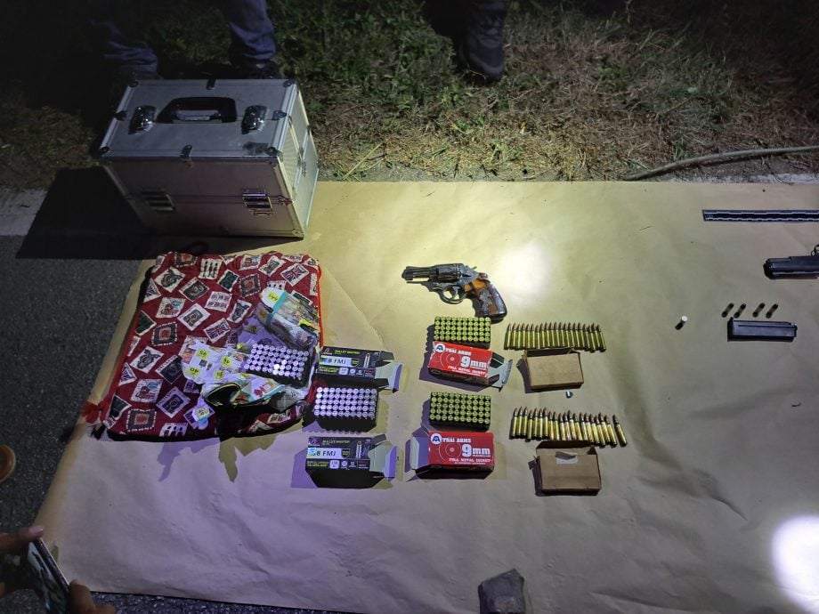 警方在凶徒车内搜获1把9毫米口径手枪、1把点38口径的左轮手枪、100枚9毫米子弹、100枚点38子弹,及一些5.56毫米来福枪子弹。
