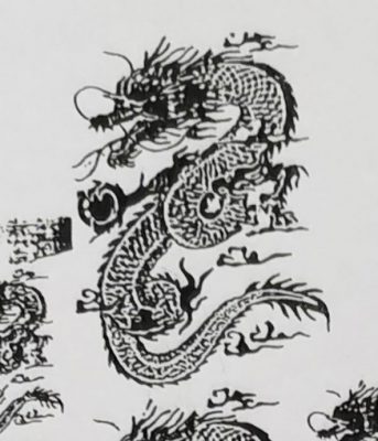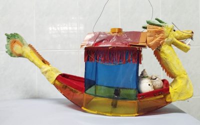 回想起来,我亦曾以自己的方式呈现龙。依稀记得小学四年级时,制作过一只龙船型的灯笼。那时临近中秋节,心血来潮想做龙型灯笼。于是用报纸扎成龙首和龙尾的雏形,贴上吸油纸后,风干上色。正当我烦恼该怎么衔接龙身时,父亲提出用铁丝为我制作船身的骨架,好让我能裹上灯笼纸;于是才决定以龙船的形态呈现“灯龙”。待龙首和龙尾成型并固定好,船架裹上灯笼纸,再用珠子装饰龙的眼睛、绒条做成龙须和龙舌;用绒布和纸皮组成龙船的踏板,上面还摆着3个用鸡蛋壳做成的福、禄、寿三星公。