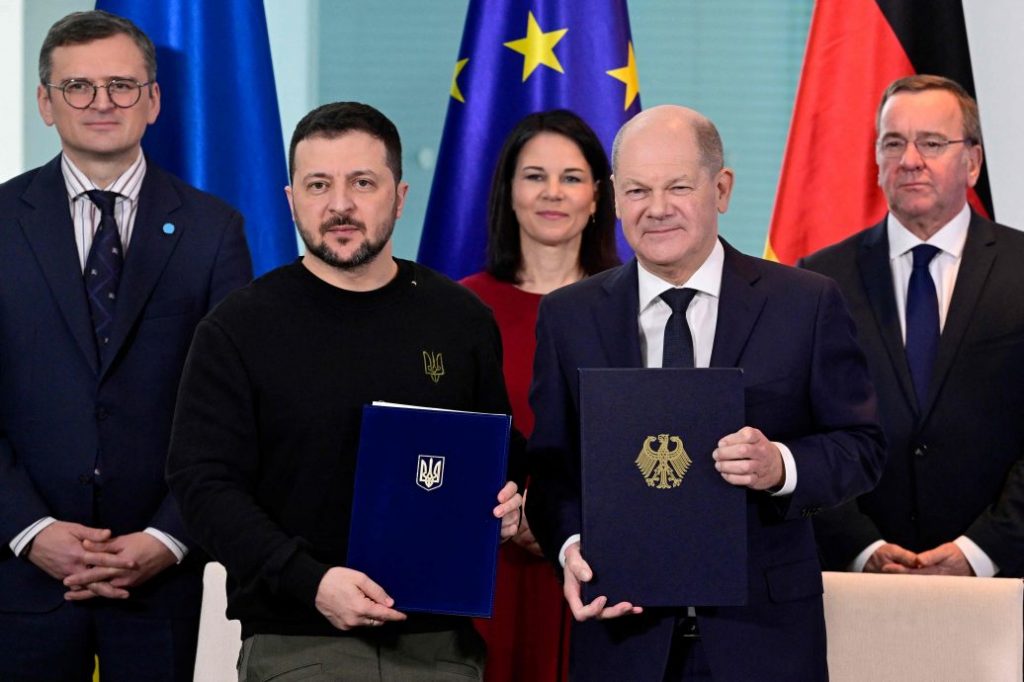 (柏林17日综合电)德国总理肖尔茨(右二)16日与乌克兰总统泽连斯基(左二)签署双边安全协议。乌克兰当局正寻求更多长期支持,以对抗俄罗斯。