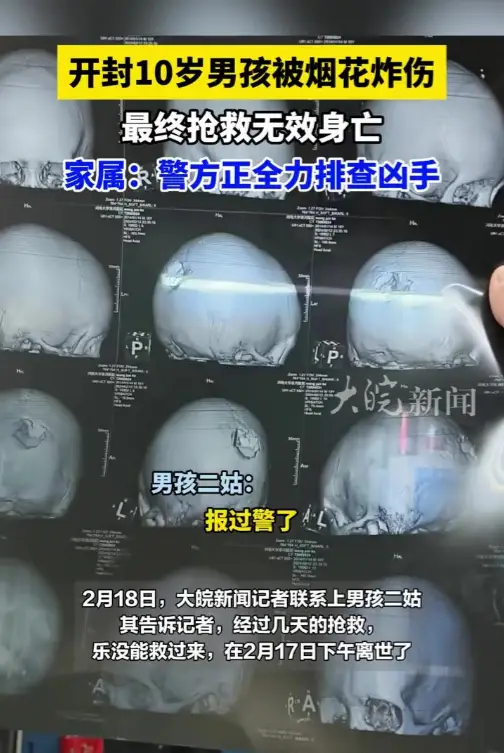 被窜出烟花炸伤后脑 10岁男孩挣扎5天后身亡