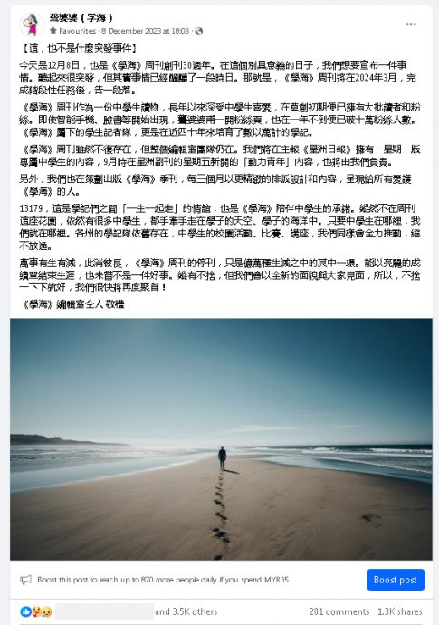 2023年12月8日,《学海》(聋婆婆)脸书宣布了将会在2024年2月完成阶段性任务后,就此告一段落,这也意味着《学海》周刊将会停刊。作为《学海》周刊的忠实读者兼学记,听到这个消息时,心宛如刀割,也觉得很意外,怎么好端端地说停刊就停刊呢?毕竟它占了我中学生涯的四分之三。