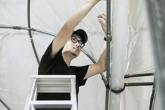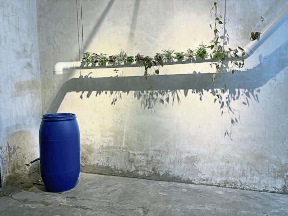 首先,他使用透明胶片和浪板取代原本的顶盖,让雨水的滴落更加可见与可听;并汇集屋顶排水至两侧,再架设水管让水源流入两个巴刹常见的蓝色大水桶。接着,他将其中一侧水管拉长处理、在里头耕种绿植。如此一来,水在流入蓝桶前,便可浇灌这些植物,让观者以另一种方式感受问题。