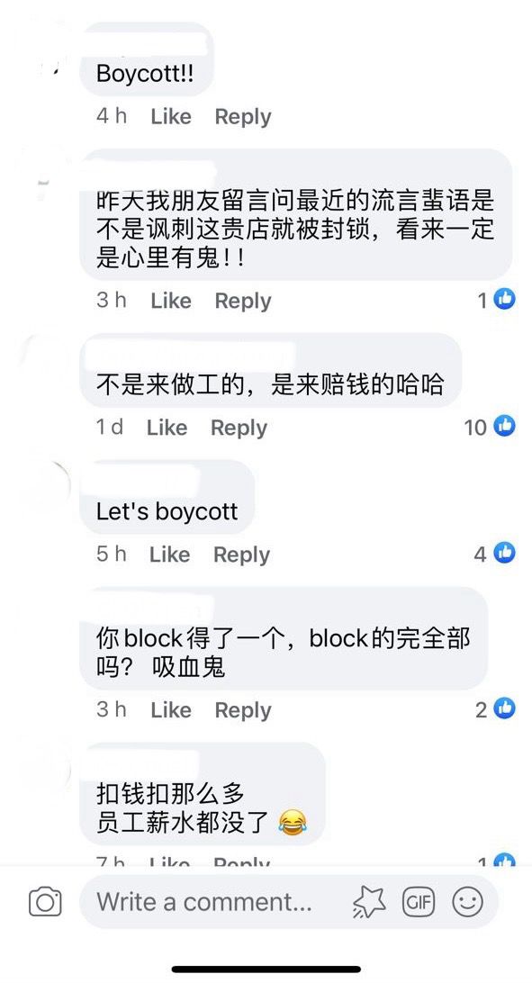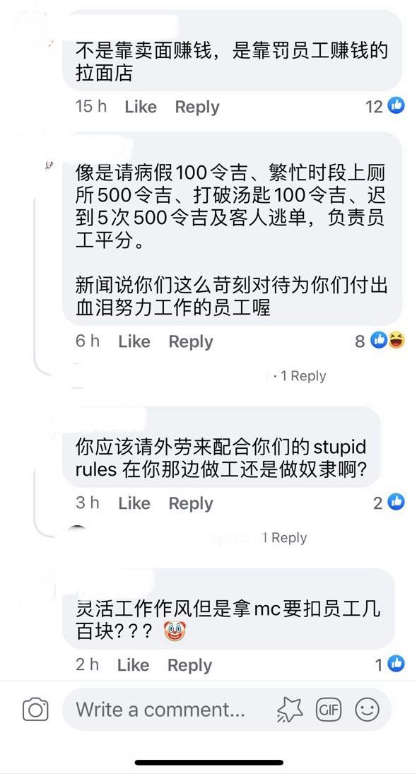 针对网民的匿名爆料,对店家列出的扣薪条例感到不满的网民纷纷到该拉面店的脸书专页留言批评。