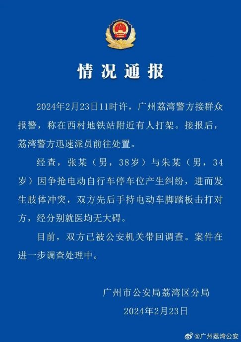 据通报,23日11时许,广州荔湾警方接群众报警,称在西村地铁站附近有人打架。接报后,荔湾警方迅速派员前往处置。
