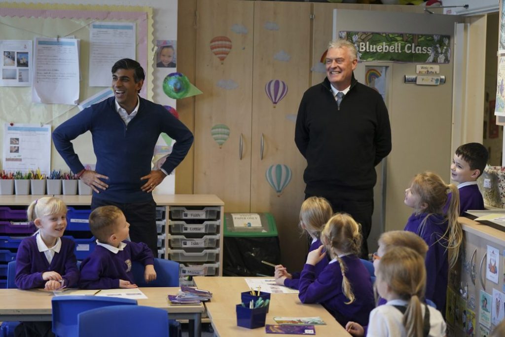 图为安德森今年1月1日陪同首相苏纳克(左)访问诺丁罕一所小学时,被小学生提问的问题逗得开怀大笑。