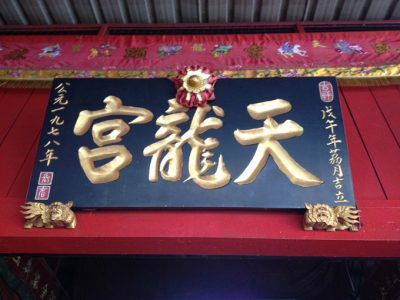 从小我最喜欢在龙庙看的两样与龙有关的物品,就是金匾额和龙椅。金匾额上刻着澄金又有灵气的三个字——天龙宫,还有龙庙建始的年份。金色字体的匾额挂在庙里的正中间,向着天,两侧有着门神。金金的字体,一直让我从小就喜欢注视着它,尤其看着这个龙的繁体字,仿佛更让我看到龙就在眼前舞动,让我很安心。