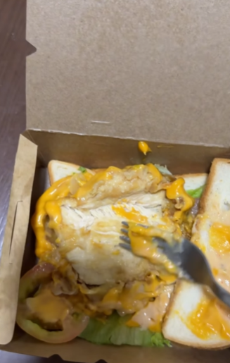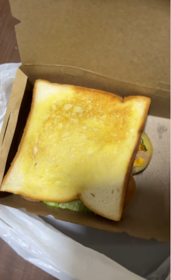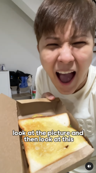 Ceddy拿到外卖打开餐盒时瞬间傻眼,对比之下可见商家所使用的高档三文治图片看起来相当可口,内陷多层丰富;实物则只是普通烤面包,以白面包夹住内陷,而且内陷坍塌不厚实,看起来十分普通。