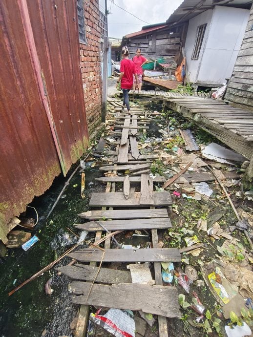 记者前往采访年逾70岁的阿米娜,走在破旧的木桥上,到处可见堆积的垃圾,环境卫生堪忧。当地居民也告知每逢下雨时,木桥变得湿滑,且当地容易发生水患。