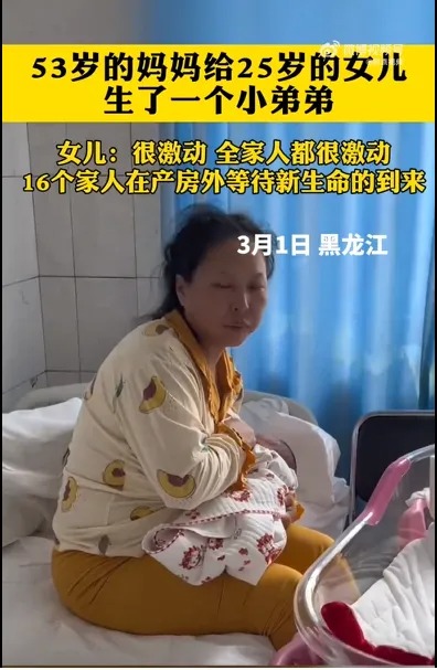 53岁母亲高龄产二胎 与女儿相距25岁