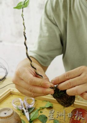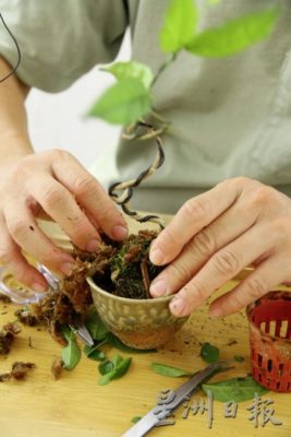 轻轻摁压小塑料花盆,将植株拉出来后,稍微修剪多余的叶子与枝条,然后取铝线量植株主干后,两层铝线从根部开始蟠扎,到较幼嫩的部分则改为一层;先构思心之所向的树态,有益于选择花器,横向生长的,可挑高而细长型,若种在短小的小器皿中,垫高有利于生长与观赏。