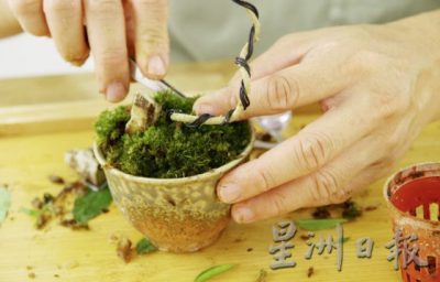 盆器里先放水苔垫底,放入植株后,再用水苔填至紧实,上方可铺盖一层高低错落的苔藓,又或以小石头点缀。步骤看似简单,但力度得把控妥当,蟠扎若太用力会折断植株,下手太轻,金属丝与枝条分离,又影响树态生长;水苔与苔藓要摁压,才能让根系与之结合,而要用多少力,全靠摸索。