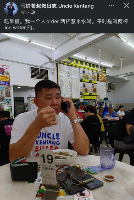 (八打灵再也7日讯)蒲种茶室自带水壶风波闹得沸沸扬扬,就连“马铃薯叔叔”也不敢轻忽,今早去用餐时特意点了两杯薏米水!