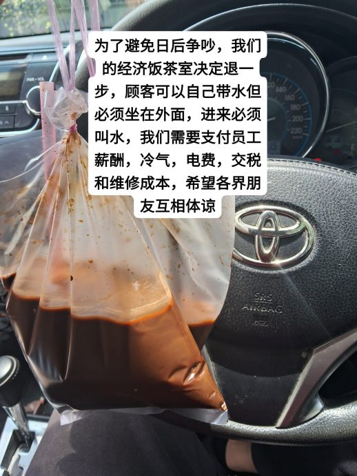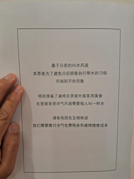 “为了避免日后争吵,我们的经济饭茶室决定退一步。顾客可以自己带(饮用)水,但必须坐在外面(的座位),进来(室内)必须点饮料。”