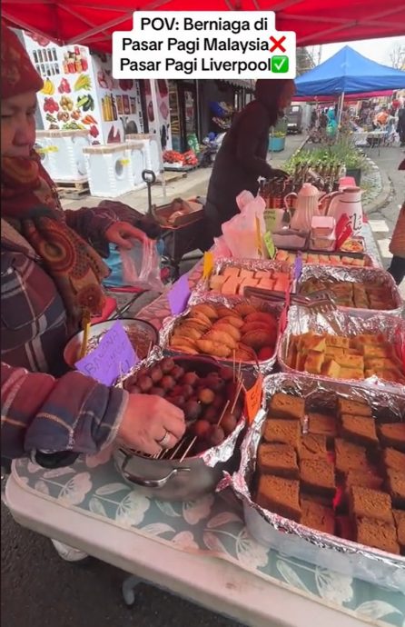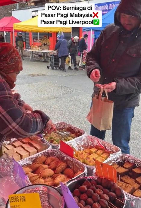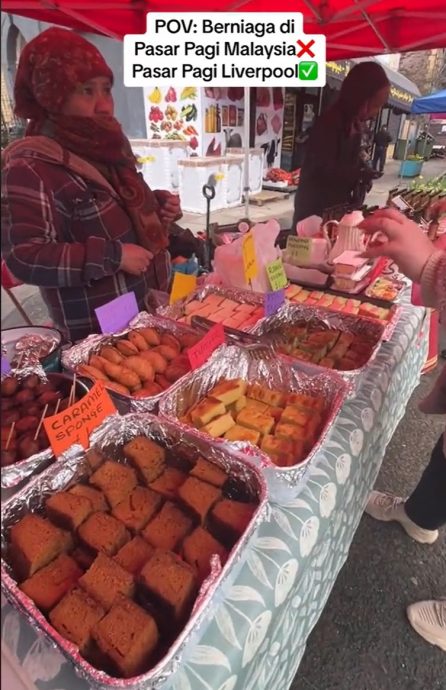 根据该TikTok用户名为“marhaidi.hanafi”的男子发布的视频,他拍下一位名叫“Doctor Syikin”的巫裔妇女,在英国利物浦一处早市摆摊,售卖各种马来西亚传统糕点。