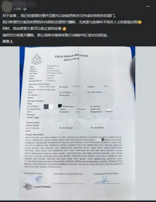 “倘若对方依旧不删除(帖文和照片),那么我会继续采取行动,维护自身的合法权益。”