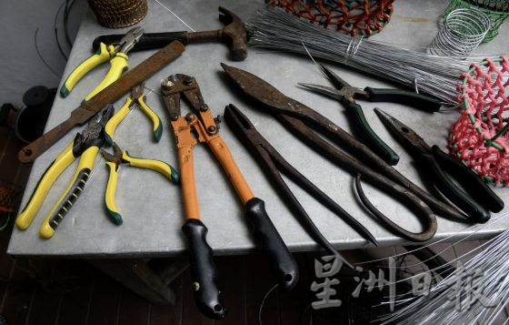 曹志明的工作室位于住家后方的小院子。百年橱柜里,一卷卷的铁丝和铜线在里头。在那之上,堆积一个个未完成的铁丝篮子,都是曹志明的心血。从前随处可见的铁篮子,他只能找手足借,“早前搬家的时候丢了很多,你看这些工具就是我爸爸的,也是从我哥哥那边借来的。”旁人眼中看似生锈的剪刀,却是曹志明的宝贝。