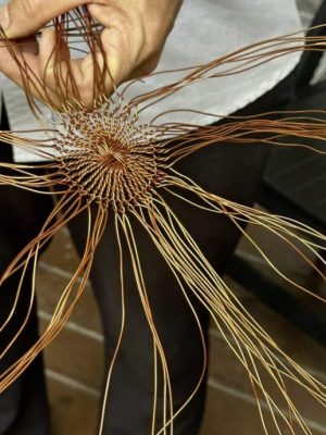 “妈妈晚年患上老人痴呆,我们担心她乱跑,买了铜线给她编织。”拿起桌上未完成的蜘蛛网状铜线制品,他接着说:“她的手其实也无法出力,在离世前只做了十多个。”后来,他编织铁篮子作为结婚礼物送给侄子,唤醒家族间的回忆。于是,曹志明决定复兴织铁这门沉睡已久的手艺。
