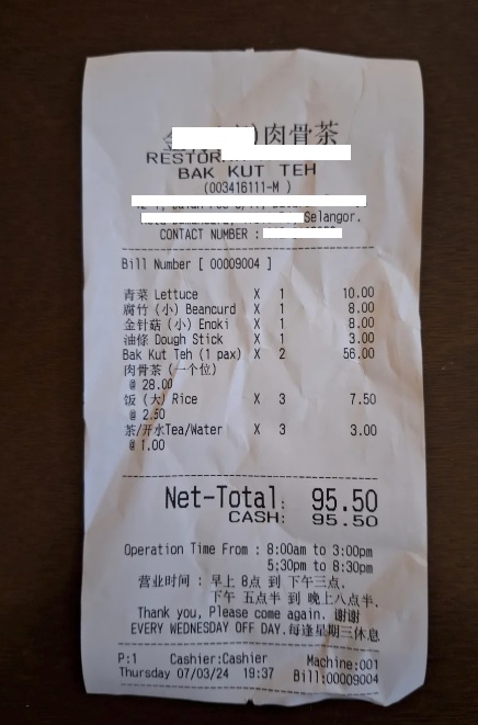 根据他上传的收据照片,除了2份肉骨茶和3碗饭,他还点了几样配菜,包括10令吉的青菜、8令吉的腐竹、8令吉的金针菇和3令吉的油条,一共95令吉50仙。