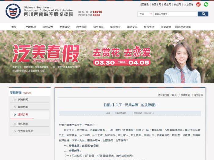 中国四川西南航空职业学院近日发布《关于“泛美春假”的放假通知》,学院所属泛美教育集团要求教育板块和实业板块的员工全部带薪休春假,引起热议。该通知安排全校师生3月30日至4月5日放7天春假(含清明放假时间),并号召所有教职工、学生,放下书本,放下工作,带上家人,带上爱侣,呼朋引伴,去度春假。