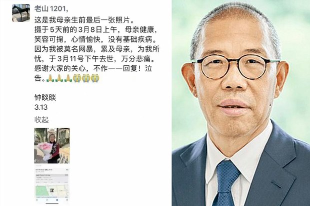 他接著表示,“因为我被莫名网暴,累及母亲,为我所忧,于3月11日下午去世,万分悲痛。感谢大家的关心,不作一一回覆!泣告。锺睒睒,3.13”。