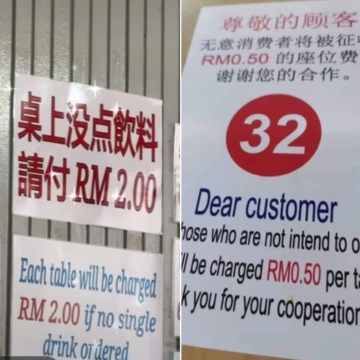 (八打灵再也15日讯)继蒲种茶室茶水风波后,近日网络疯传两张茶餐室张贴不点饮料被征收坐台费的告示牌照片,其中一张照片显示没点饮料的顾客会被征收50仙座位费,另一张照片则显示要向没点饮料的顾客征收2令吉,引起哗然。