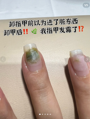 美甲师对此表示应该是绿脓杆菌,造成此事的原因有两种,一是上一次美甲工具没消毒干净,从别的客人传染而得;二则是上次美甲师没做好封边处理,导致美甲进水,过于潮湿而导致发霉。
