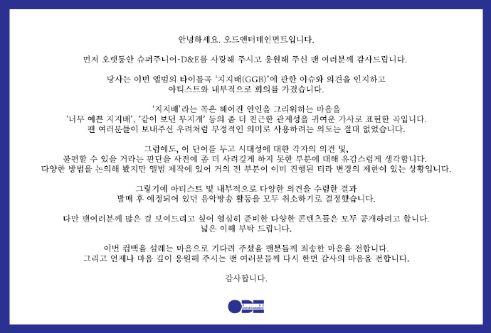 对于因欠缺考虑而引起的不适,D&E深表歉意,随后也宣布取消所有原定要上的音乐放送节目,避免争议再扩大,让粉丝傻眼,指经纪公司的做法太极端。