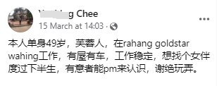 芙蓉一名49岁单身男子,日前将自己的照片和资料放上脸书个人主页,表示自己想找个女伴度过下半生。