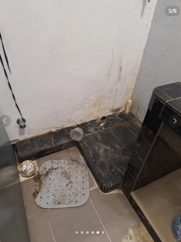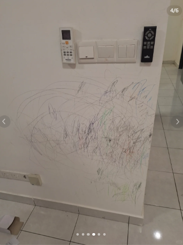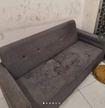 根据他所上传的图集显示,灰色沙发布满水印痕,白色墙壁也被画满五颜六色的涂鸦,就连地板墙角也有恶心的黄褐色污渍。