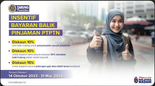 从2023年10月14日起至2024年3月31日,为偿还PTPTN贷款提供以下折扣优惠: