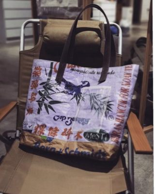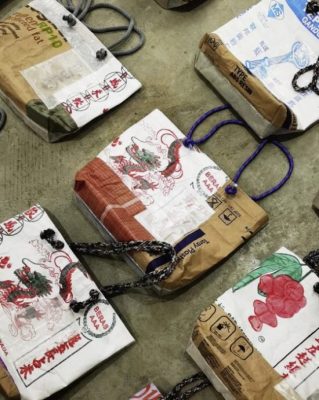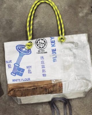 “装洋灰和米的袋子是我们最先想到的,因为它们的袋子本身就防水。”后来,两人身旁有熟人的父亲在经营米厂,也愿意供应米袋,“就这样本来被丢弃的袋子,被我们拿来做成买菜的包。虽然买菜包的材质不需要到很精致,但不能少了设计。”