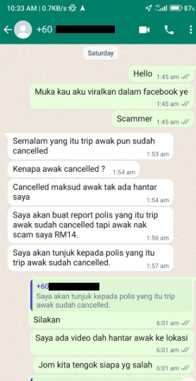 该司机也贴出了自己事后与该女乘客的WhatsApp对话截图,司机一开始就对女子说,他已经在脸书放出女子的照片,并指女子是骗子。