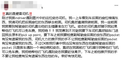 “我察觉到不对劲,我要下车,司机竟然锁车门送我回去接驳点,下车前,我要检查副驾驶座后面的放东西的袋子有没有遗留我的东西,司机大力的推开我的手,不让我检查,幸好有惊无险。”