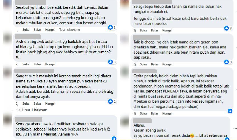 在评论区,网民们表示对兄妹俩遇到的事感到难过,“没关系,你们都是最棒的孩子,无论对错,他们都是我们的至亲”、“许多家庭就是这样出现纷争,不知前因后果也想分一杯羹”、“土地还在你爸爸名下,所以不能跟他吵,即使他不再了,如果没有完成割名手续也会争个你死我活”。