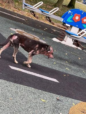 一只流浪狗疑被不明人士泼热水,导致它全身严重烫伤至皮肤溃烂,头部毛囊和毛根相信被烫伤坏死,无法长出新毛发,非常可怜。
