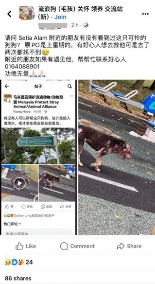 她说,附近朋友如果有遇到这只流浪狗,可以联系016-408 8901。