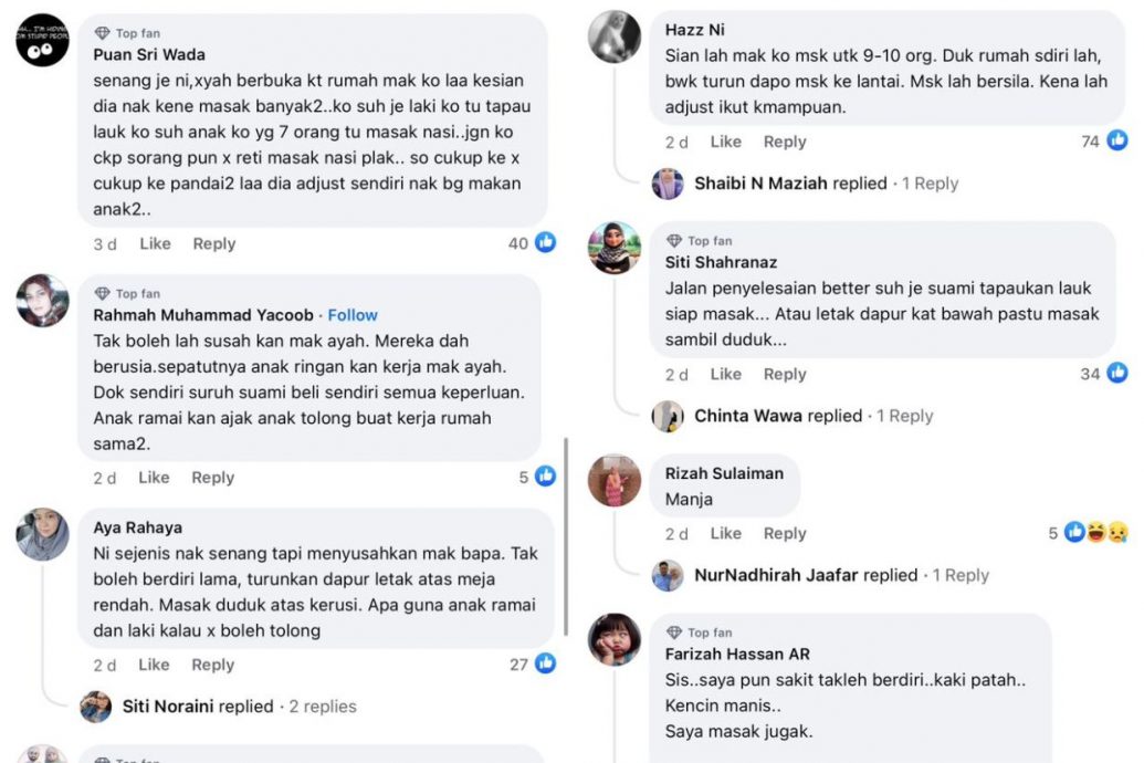 她的贴文上传脸书后,许多网民都发表自己的看法,当中大部分人留言,认为这位女子不应该让年迈的妈妈来给他们一家做饭,给老母亲带来负担。