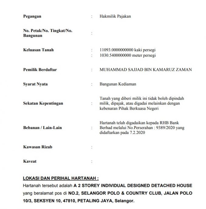 他过后于2022年在Instagram帖文分享准备以950万令吉拍卖其洋房的讯息,欢迎任何有兴趣的买家联络负责人。