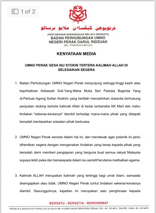 “真主一词对穆斯林来说是最高的词汇,不论是有意还是无意,霹雳州巫统敦促当局采取最严厉的行动。实际上,这是对马来人信奉的联邦宗教,即伊斯兰的圣洁性来说是一种侮辱。”