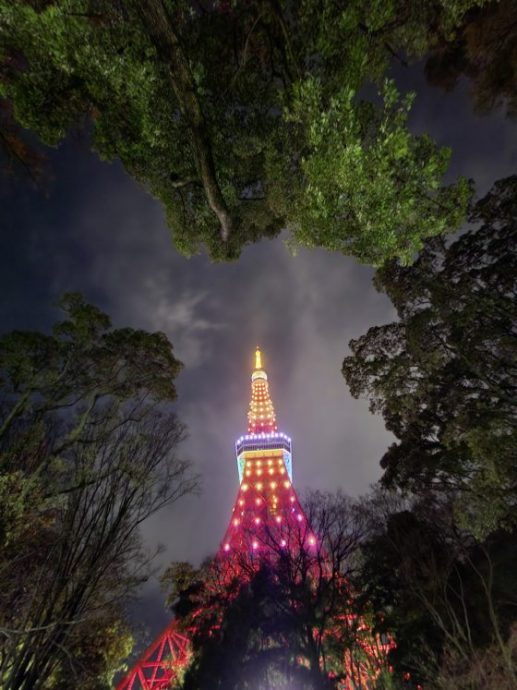 东京铁塔在芝公园的树木环绕下散发最美的光亮。(摄影/陈伟哲)