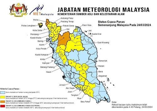 同时,玻璃市全州、霹雳的上霹雳及沙巴的保佛将连续3天,出现介37度至40度间的高温,因此气象局向3个地方发布二级热浪警告。