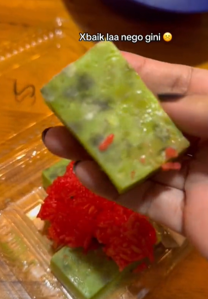 网民@syabiebieyhalymm在TikTok发视频揭露,当她剥开糕点上的一团彩色糯米时,发现糕点表面长满了灰白色的霉斑,明显是霉菌滋生的迹象。