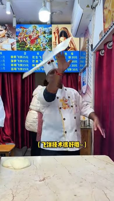 根据视频,印裔男子还表演了他的“飞饼绝技”,在准备过程中,将印度煎饼飞甩到空中,看得顾客不亦乐乎。