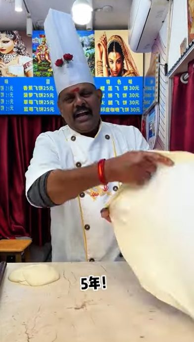 他的印度煎饼一份售价为人民币25元(约16令吉),特色口味则为一份30元(约20令吉), 其中包括了在大马为人熟知的“香蕉煎饼”(Roti Pisang)。