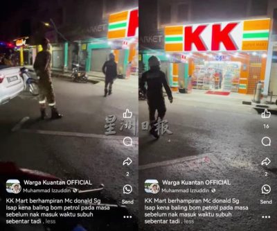 另一方面,网民莫哈末依祖汀今早7时许在关丹脸书群组发布的一段短视频,显示双溪依萨KK便利店遭不明人士抛掷汽油弹后的画面。该汽油弹的火焰虽然导致便利店入口处的塑料地毯及靠近门口的货架部分货品被烧毁,不过由于店员时灭火,未酿成严重火患。视频画面中显示,消拯人员接获投报后,也抵达现场确认灾情和展开调查。