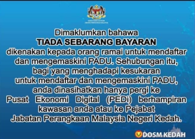 (双溪大年30日讯)统计局吉打分局强调,民众注册或更新主要数据库系统(PADU)账号时,不需支付任何费用。