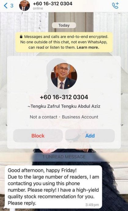 投资、贸易及工业部长东姑赛夫鲁表示,民众若最近收到关于他推荐买股的信息,请忽略有关信息,并且向有关当局举报。