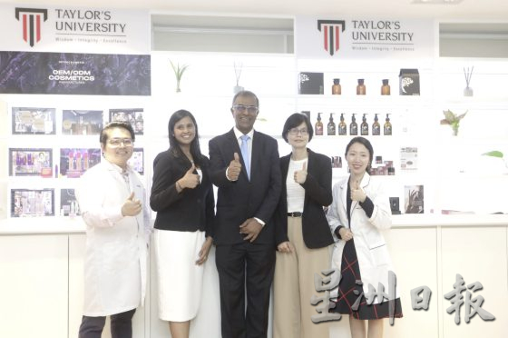 生提供基于工作学习模式(Work-Based Learning)以及化妆品科学辅修课程。左起为药学院高级讲师张圣贤、雷努卡施拉班、P.T.汤姆斯教授、黄嘉玮、药学院讲师陈彩漪。
